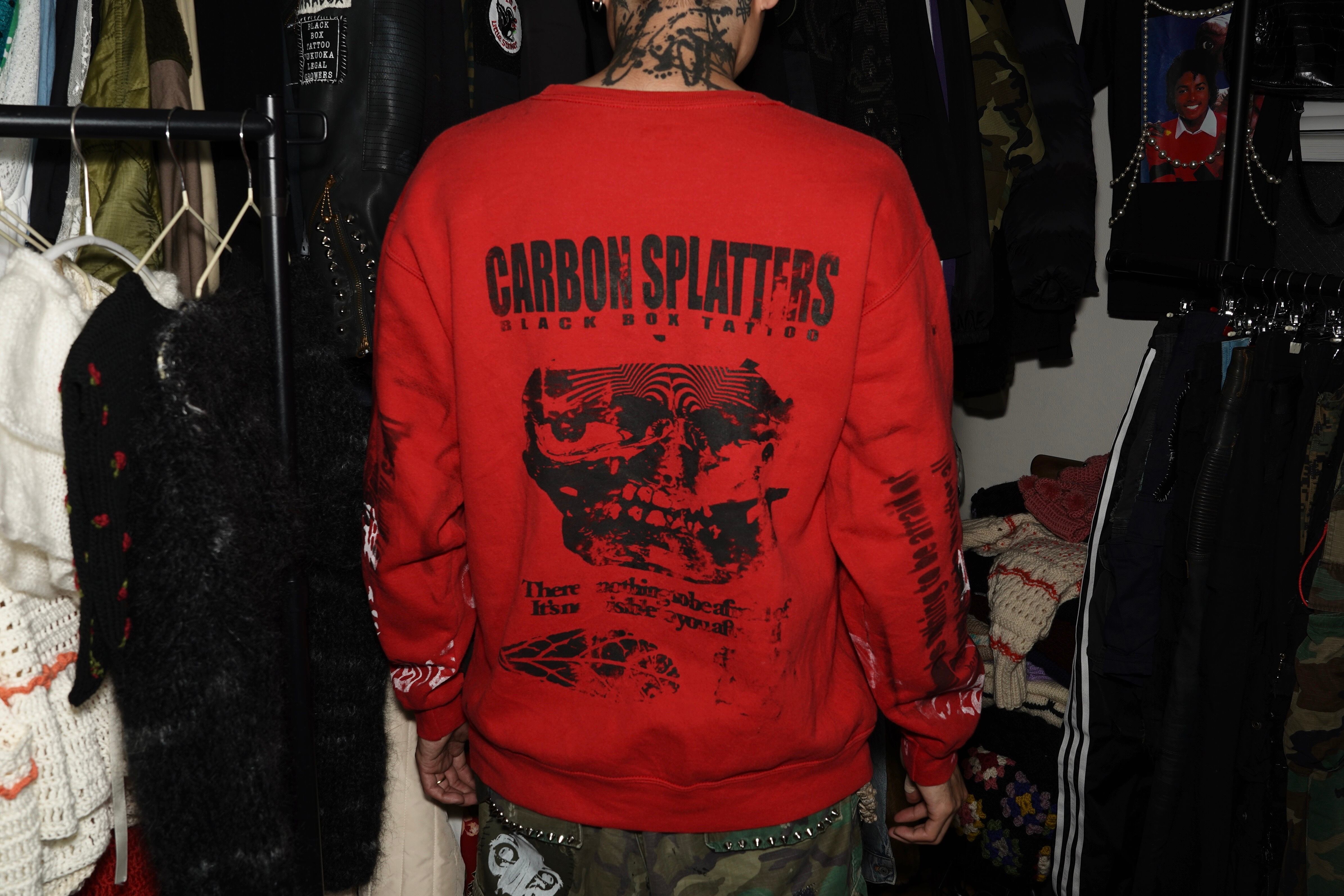 直接ペイントし、パッチ等を縫い付けています。一点物です。