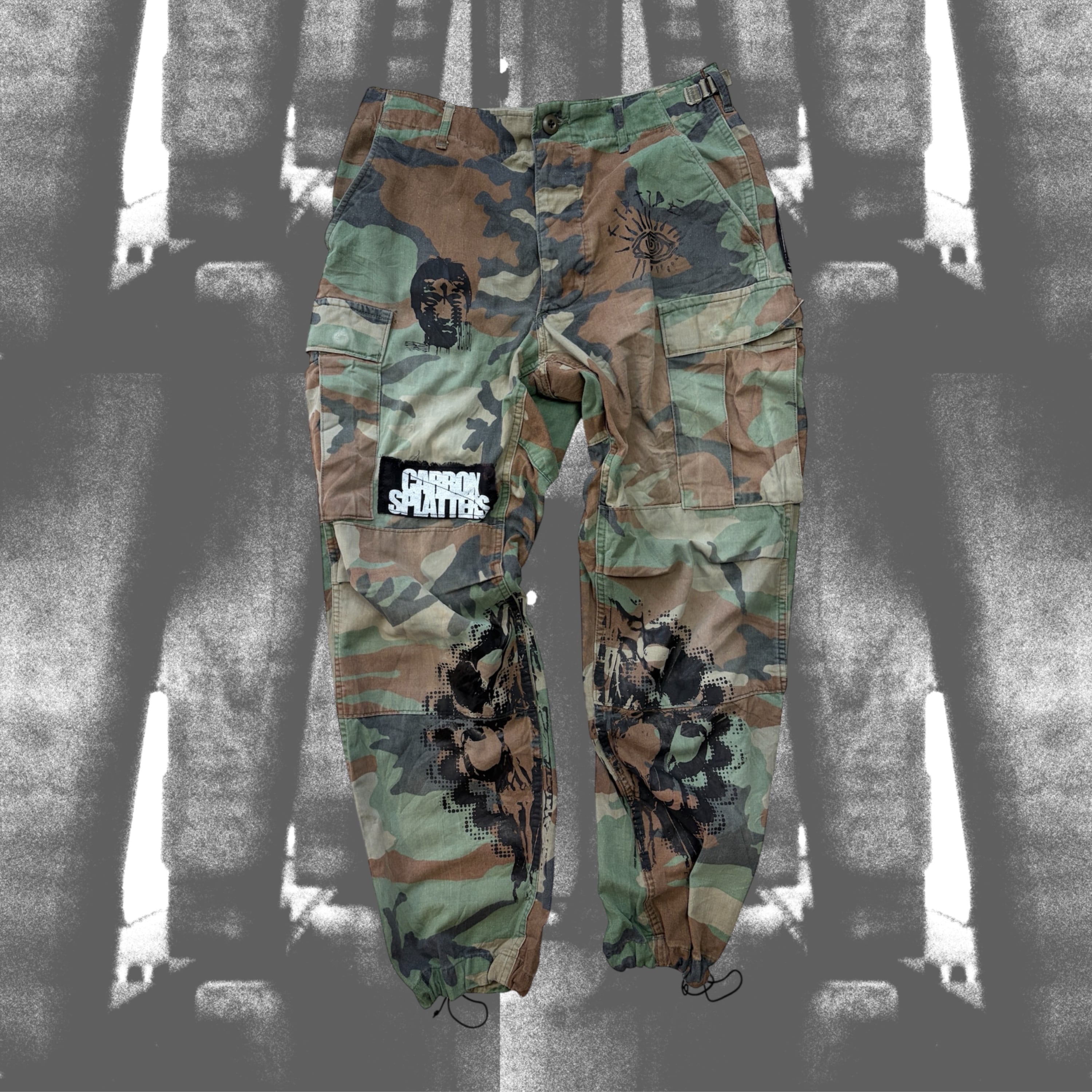 ・ダメージ加工を施したミリタリーパンツにシルクプリントやパッチを縫いつけました。